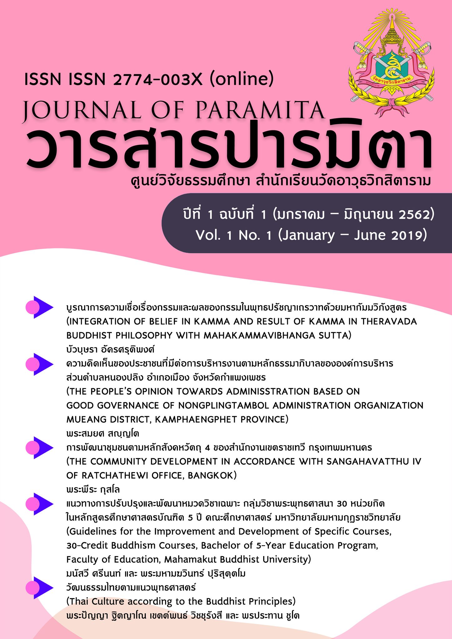 พ.ศ. 2562 นับว่าเป็นปีที่ 1 ในการจัดพิมพ์วารสารปารมิตา ศูนย์วิจัยธรรมศึกษา สำนักเรียนวัดอาวุธวิกสิตาราม โดยทางกองบรรณาธิการได้บริหารจัดการวารสารให้เป็นไปตามเกณฑ์มาตรฐาน TCI มีการตรวจประเมินผลงานวิชาการจากผู้ทรงคุณวุฒิจากหลายหน่วยงาน กล่าวคือมีการเชิญผู้ทรงคุณวุฒิ 2 รูป/คน ประเมิน 1 บทความ เพื่อเป็นการรักษามาตรฐานทางวิชาการนั่นเอง และในโอกาสต่อไป เมื่อวารสารได้การรับรองคุณภาพจาก TCI แล้ว ก็จะเน้นการบริหารวารสารทั้งในเชิงคุณภาพและเชิงปริมาณให้เรียบร้อยและมีประสิทธิภาพประสิทธิผลต่อไป